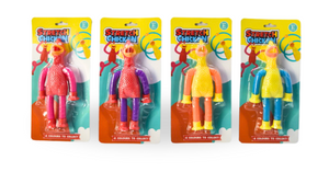 Crazy 18cm soft plastic body with concertina arms and legs with suction caps on the ends. Stretch him, stick him, squish him so he squawks!