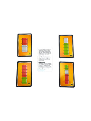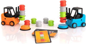 Start the round by drawing a card. Your goal is to stack the barrels to match the challenge card and then place that stack on your platform first using ONLY one of the two toy forklifts.