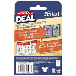 In the Monopoly Deal: Disney Stitch Edition kids card game, compete to collect familiar items from Stitch’s world.