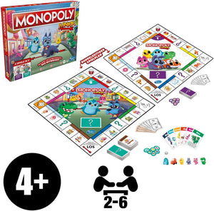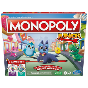 With 2 games in 1, this Monopoly Junior game is the little earners game that grows with your child! Its double-sided gameboard offers 2 levels of play, so families can decide which level is best for them. The Level 1 game, recommended for ages 4-5, helps kids practice matching and counting, as they count spaces, match pictures, and buy properties.
