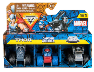 Charge into thrilling Monster Jam battles with the official mini Monster Jam Marvel 1:87 scale die-cast truck 3-Packs!