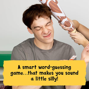 Poetry for Neanderthals is a competitive word-guessing card game from Exploding Kittens where you must speak good or get hit with a NO stick