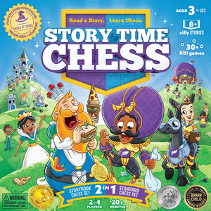 Story Time Chess is a board game that teaches chess to young children using silly stories, vibrant illustrations, custom chess pieces, and a unique chess board.