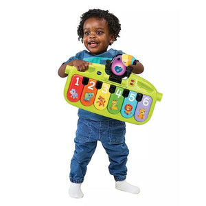 Listen and move to the rhythm of Toucan's tuneful music using the musical instrument accessories and take-along piano! These include a guitar rattle, squeaky drum, maraca, sheet music, and a tambourine mirror - promoting self discovery. Babies can understand rhythm by following Toucan's light up tummy which changes colour with the music.