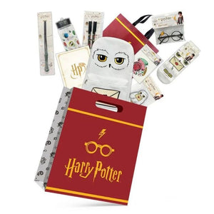Welcome to the Harry Potter Classic Showbag! This magical collection includes a stylish backpack, a refreshing cold pack, a durable drink bottle, a charming pen set, cozy socks, cool tech decals, iconic glasses, an enchanting wand, a complete writing set, and a convenient non-woven bag.