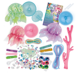 Includes: 3 glow in the dark domes, Coral branch hanger, 3 Fabric dome covers, 63 Glow in the dark beads, 70 colorful beads, 3 Mash tube cords, Ribbon, Glow in the dark strings and plastic wire, 3 Glitter stickers, Coralia's Complete story and Color instructions.
