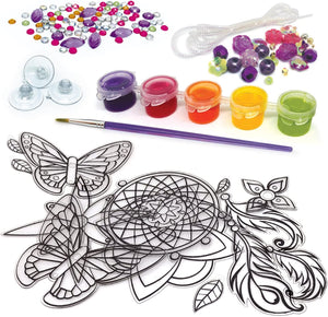Includes: 13 ready-to-paint cut pieces , 5 colours of glass paint, Paintbrush, Assorted beads & cord, Variety of rhinestones, 3 suction cups , Colour instructions, Hazelia’s story pamphlet.
