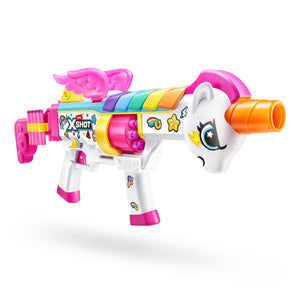 Introducing the bold and brave XSHOT Big Rizz Blaster, where fierce blaster meets whimsical unicorn to create your latest formidable winged warrior. The Big Rizz lights up the battlefield with its illuminating horn and flapping wings bringing an explosion of colour and excitement to your battles.