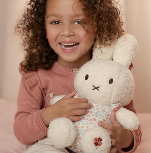 Come give Miffy a cuddle! She is soft and sweet, and always ready for a cuddle. While playing on the go or at bedtime, she’s always there for little ones. Miffy, made of soft plush and printed corduroy, is 30cm tall and is now wearing a beautiful outfit with the Lucky Blossom print, designed by Little Dutch. There is a playful bell in the cuddly toy. A lovely addition to the baby room!