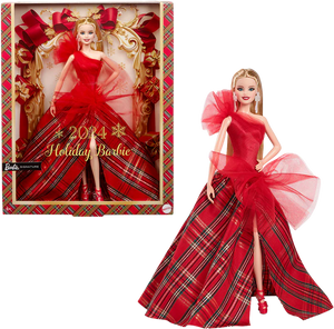The 2024 Holiday Barbie doll embodies the warmth and love of the season with a festive gown and party look! Showcasing gorgeous drama, the dress pairs a draping, one-shoulder, sparkling red bodice with a full, plaid ballgown-style skirt.