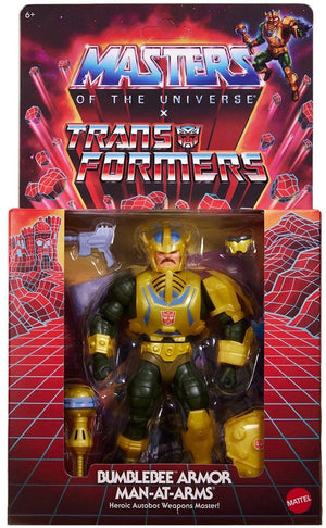 A collaboration of iconic toy brands no one expected Hasbro's Transformers and Mattel's Masters of the Universe has created this distinctive Bumblebee Armour Man-At-Arms action figure! This Heroic Autobot Weapons Master has MOTU character Man-At-Arms outfitted with the iconic yellow armour of the Transformers' Bumblebee!