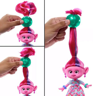Queen Poppy fashion doll has both furry, plush, removable hair and soft, attached hair -- take off the plush hairpiece to reveal a gem-shaped container with surprise accessories inside, then use the plush hair as a fashionable, furry coat for the doll!
