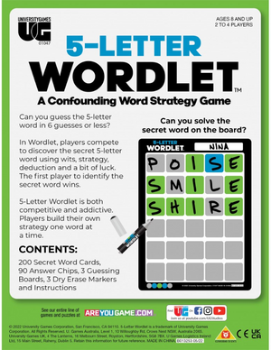 In this entertaining board game, players compete to discover the secret 5-letter word using wits, strategy, deduction and a bit of luck. The player to first identify the secret word wins the round, and the player with the most wins at the end of the game wins big!
