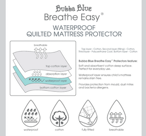 You and your baby can rest easy with the fitted Breathe Easy® Standard Cot Waterproof Quilted Mattress protector. The waterproof underlay stops leakages to keep your child’s mattress clean with the extra comfort of cotton diamond-shaped padding on top.