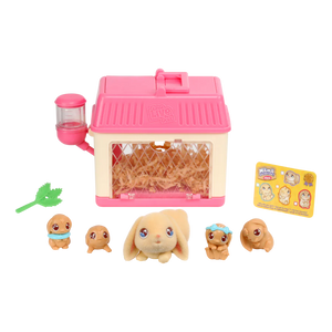 Feed her with celery and her eyes will close. Then place her on top of the paper straw in the mini hutch and close the door. Fill the water bottle and watch as the water disappears! She is ready to magically have 2, 3 or 4 babies. You’ll be so surprised at who arrives! There are up to 4 adorable babies to discover! Dress them in the surprise accessories.