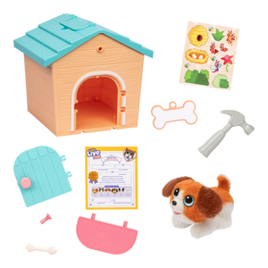 My Puppy's Home Minis comes as a house playset with everything you need to build and complete your puppy's home! Attach the door and the welcome mat, decorate with stickers and hammer in the name plate!