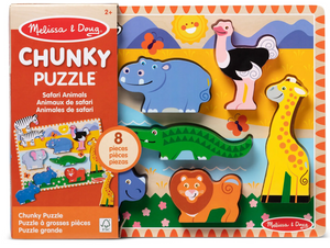 African animal favorites are featured on this extra-thick wooden puzzle. Eight easy-grasp, chunky wild-animal pieces have a full-color matching pictures underneath. The animal pieces stand upright for pretend play. Encourages hand-eye, fine motor and creative expression skills.