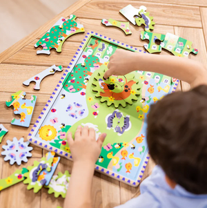 Piece together an animal-themed 24-piece wooden jigsaw puzzle with 4 interlocking gears that spin!