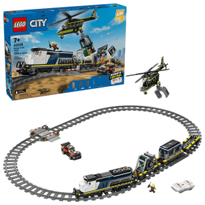 All aboard for nonstop action with the LEGO® City Police Train Heist (60508) toy train playset for ages 7 and up. This Powered Up electric train set for kids includes a working locomotive and 3 flatcars carrying a prison cell, bank safe and rally car. The set also includes an oval train track with a railroad crossing and a track piece for re-railing trains. Just add the model helicopter with working grabber claw and the detective, police officer, train driver and 3 crook minifigures for imaginative train heist adventures.
