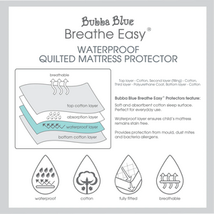 You and your baby can rest easy with the fitted Breathe Easy® Waterproof Quilted Mattress protector. The waterproof underlay stops leakages to help keep your child’s mattress clean with the extra comfort of cotton diamond-shaped padding on top.