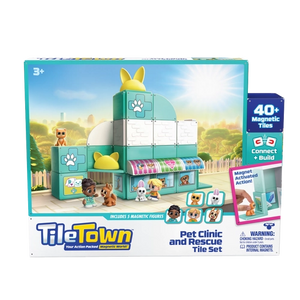 Create a world that comes to life using TILE TOWN’S unique and interactive ACTION TILES and fun Play Figures. Build the Tile Town Pet Vet. 48 pieces. Includes a Vet figure, Cat, Dog and Bunny.