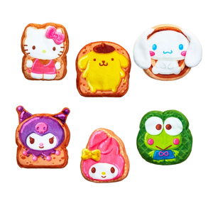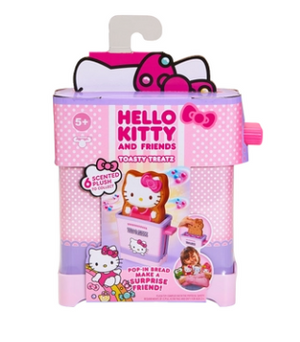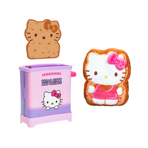First, pop the bread into the toaster slot, then slide the toy toaster's handle down. Now slide the handle back up to reveal the cutest Hello Kitty® and Friends Toasty Treatz surprise plush. Toasty Treatz are soft, squishy and deliciously scented collectible plush in the shape of Hello Kitty® and Friends adorable breakfast treats. Which one will pop up?