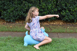 Introducing Ozzie the Blue Heeler Bouncy Rider by Kaper Kidz, a delightful inflatable ride-on companion that brings the spirit of a loyal canine friend to your child's playtime. With his charming blue color and adorable ruff ruff dog-themed scarf, Ozzie exudes playful charm and invites imaginative adventures.
