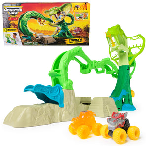 Launch into chaos with the Monster Jam, Cobra’s Crazy Escape playset. Loop into action with two exclusive Mini Jam trucks, ThunderROARus and JCB Digatron with gem themed details. This motorised 71cm long playset delivers endless excitement as you load in your trucks into the looping jungle track.