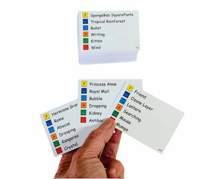 Played in teams, the idea is to describe as many card entries as possible to your team mates in 30 seconds without giving "begins with" or "sounds like" clues.