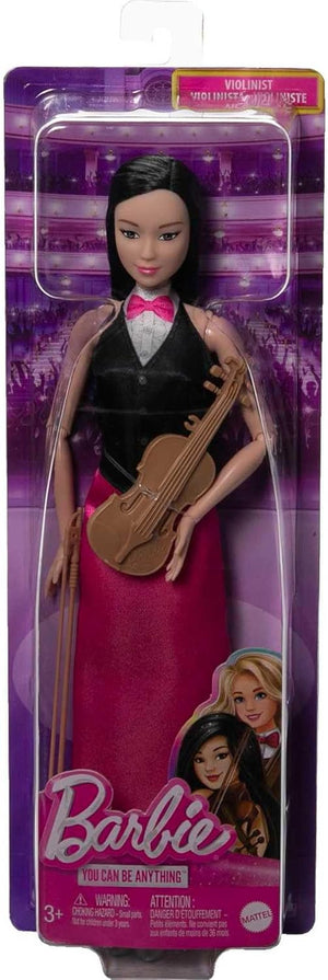 The talented Violinist Barbie® doll takes the stage! This magnificent musician comes with a violin and bow and she's ready to steal the show wearing an elegant dress with a tuxedo vest. Barbie® doll bends at her shoulders and elbows so kids can really help her 'play' the violin.