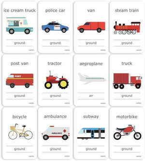 This set of transport themed flash cards is designed to help kids to learn ground, air, and water transportation vehicles in daily life.