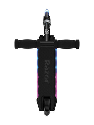The classic Razor kick scooter is made even beer with the addition of multi-color LED lights that don't require batteries! Kick 2 Glow's front wheel and deck are lit through the power of moon. Push off and the lights turn on!