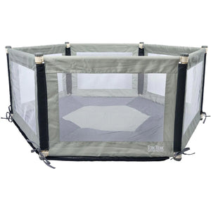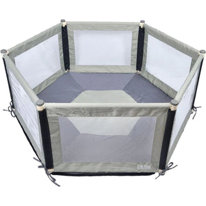 The Pokano Fabric Hexagonal Playpen & Mat is crafted from durable, washable polycotton fabric with large free-flow netting windows in every panel. The integrated non-slip rubberized feet provide added assurance and stability. The corner mechanism was custom-designed by TikkTokk to provide quick and easy assembly, with a convenient transport bag and thickly padded, reversible floor mat included.